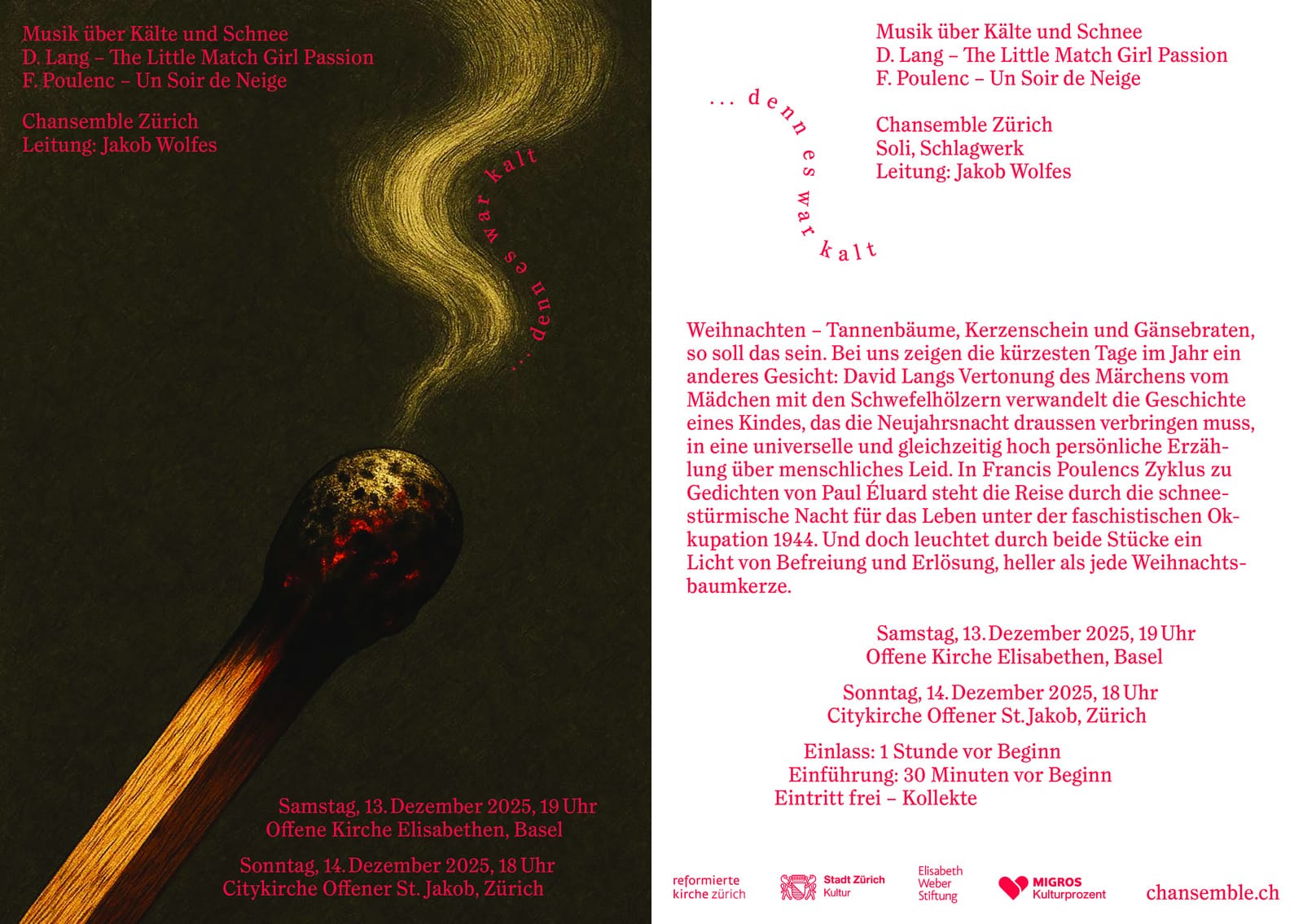 Weihnachten – Tannenbäume, Kerzenschein und Gänsebraten, so soll das sein. In diesem Konzert zeigen die kürzesten Tage im Jahr ein anderes Gesicht: David Langs Vertonung des Märchens vom Mädchen mit den Schwefelhölzern verwandelt die Geschichte eines Kindes, das die Neujahrsnacht draussen verbringen muss, in eine universelle und gleichzeitig persönliche Erzählung über menschliches Leid. In Francis Poulencs Zyklus zu Gedichten von Paul Éluard steht die Reise durch die schneestürmische Nacht für das Leben unter der faschistischen Okkupation 1944. Und doch leuchtet durch beide Stücke ein Licht von Befreiung und Erlösung, heller als jede Weihnachtsbaumkerze.